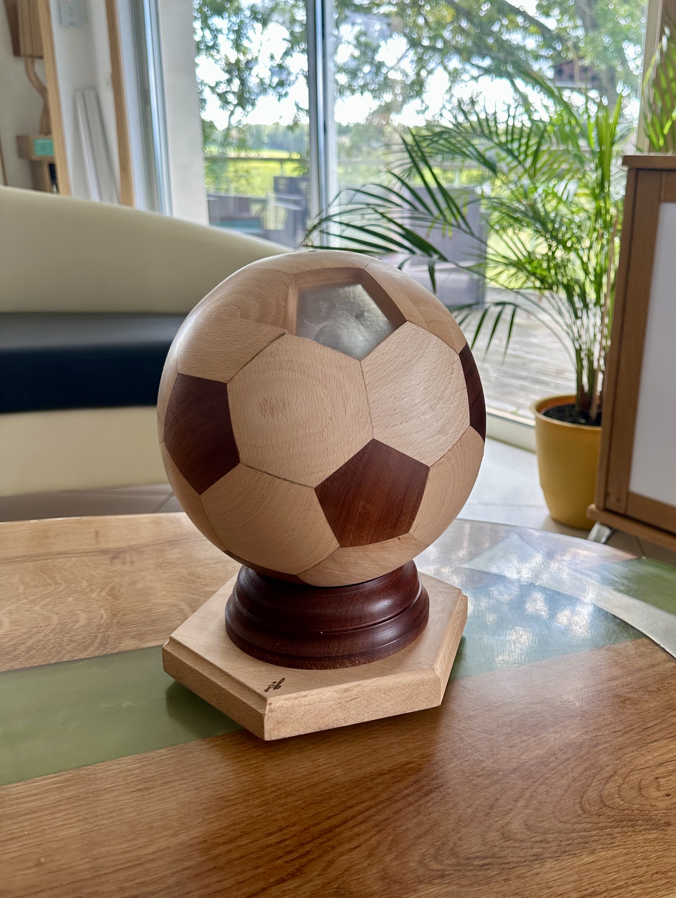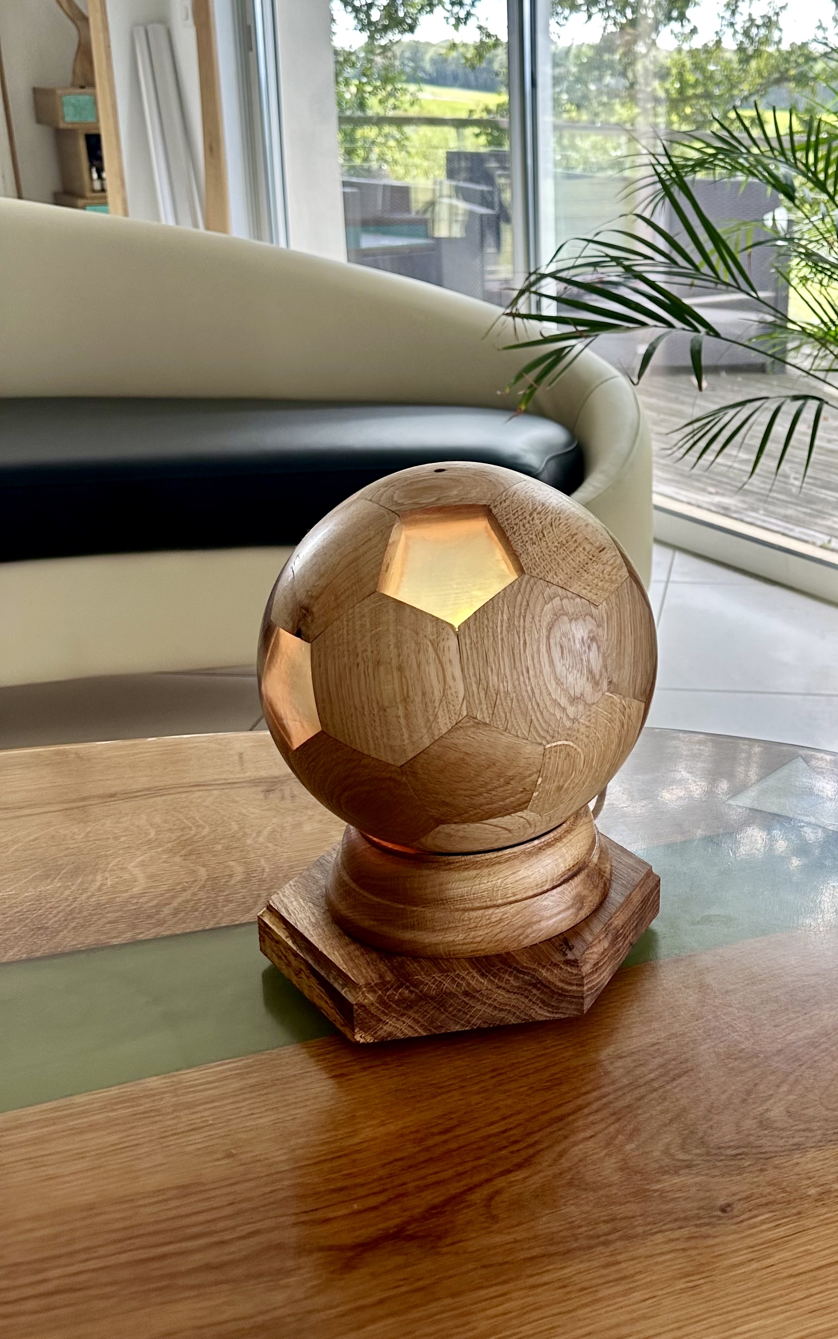Découvrez nos ballons de foot lumineux, une création unique pour les passionnés de football. Fabriqués à partir de différentes essences de bois telles que le chêne, le noyer, le hêtre et le bois local du Loiret, sauf le Sipo , nos ballons offrent des nuances de couleur uniques. Le bois utilisé provient d’Afrique, sélectionné spécialement pour sa beauté et ses caractéristiques esthétiques.