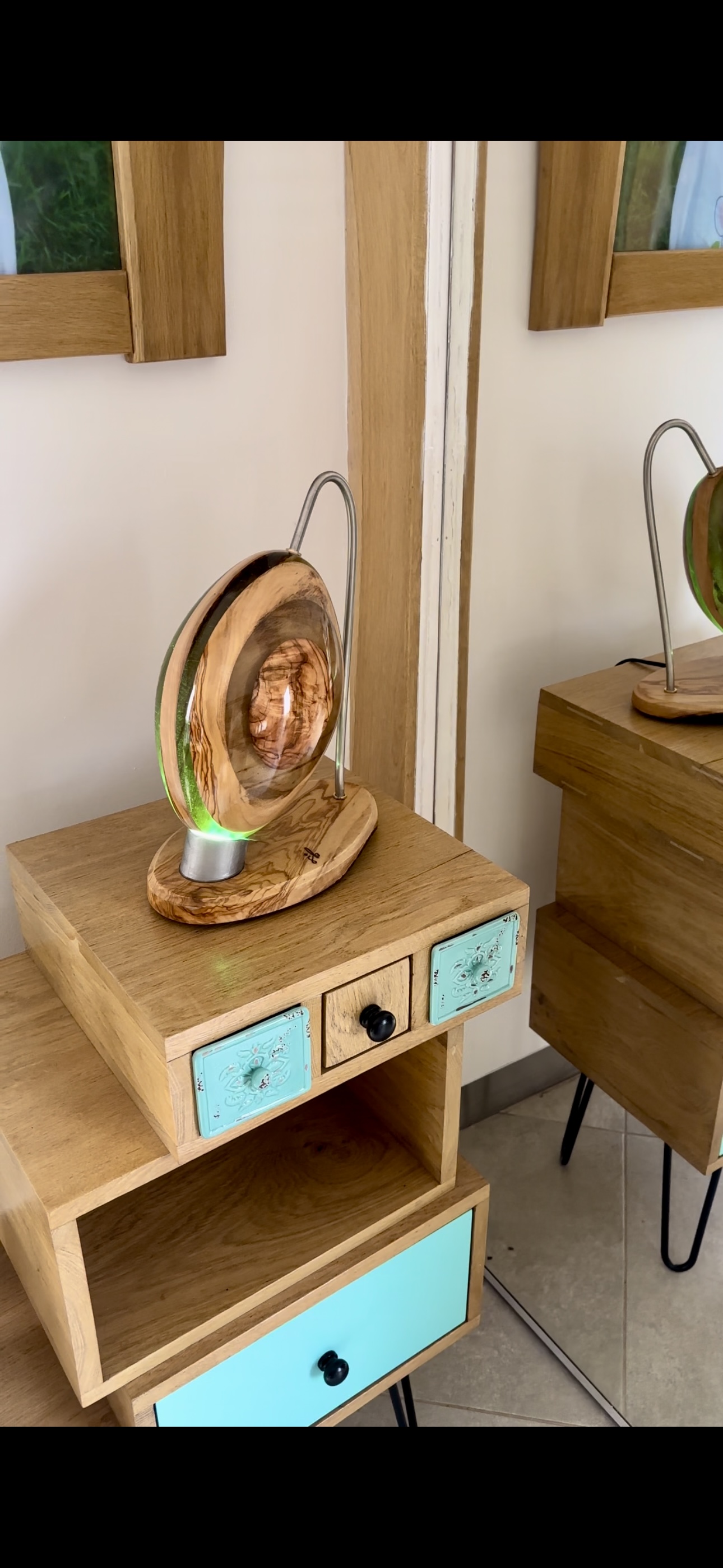 Cette création allie harmonieusement le bois et la résine, offrant ainsi un éclairage subtil et personnalisable.