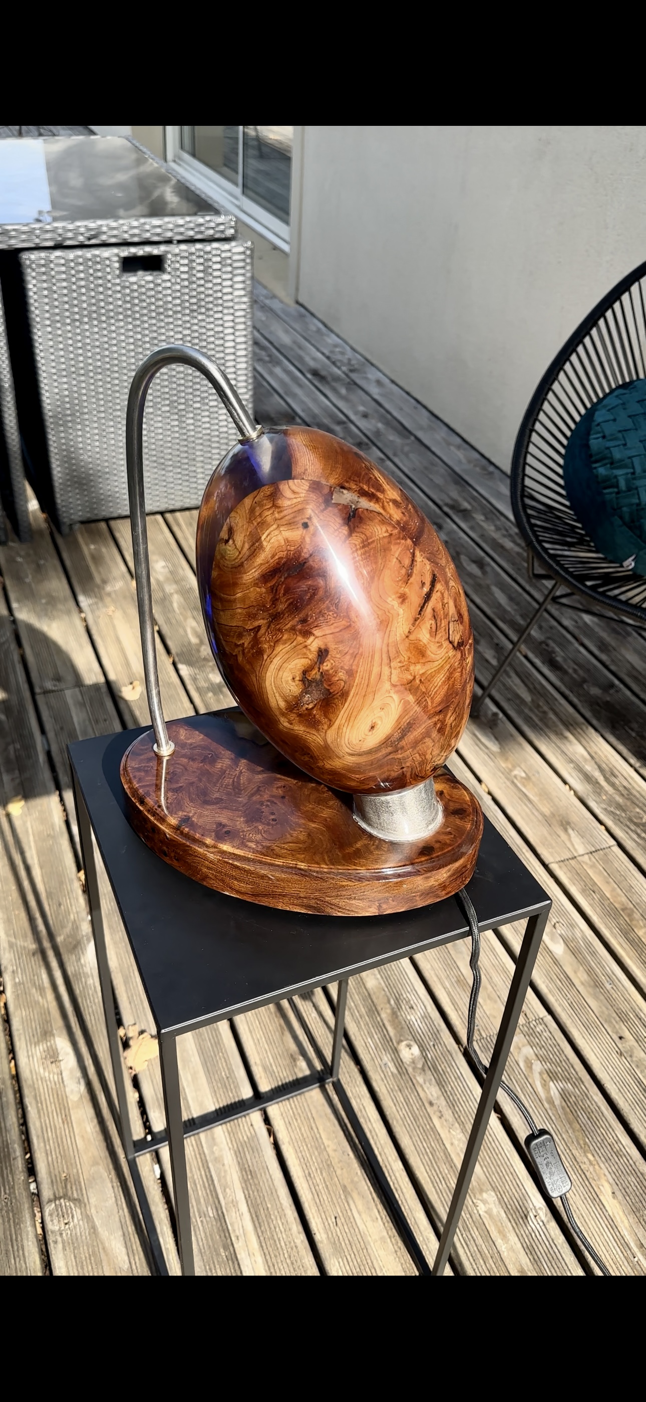 Une partie de la lampe est réalisée en bois, utilisant différentes essences pour créer une esthétique unique.