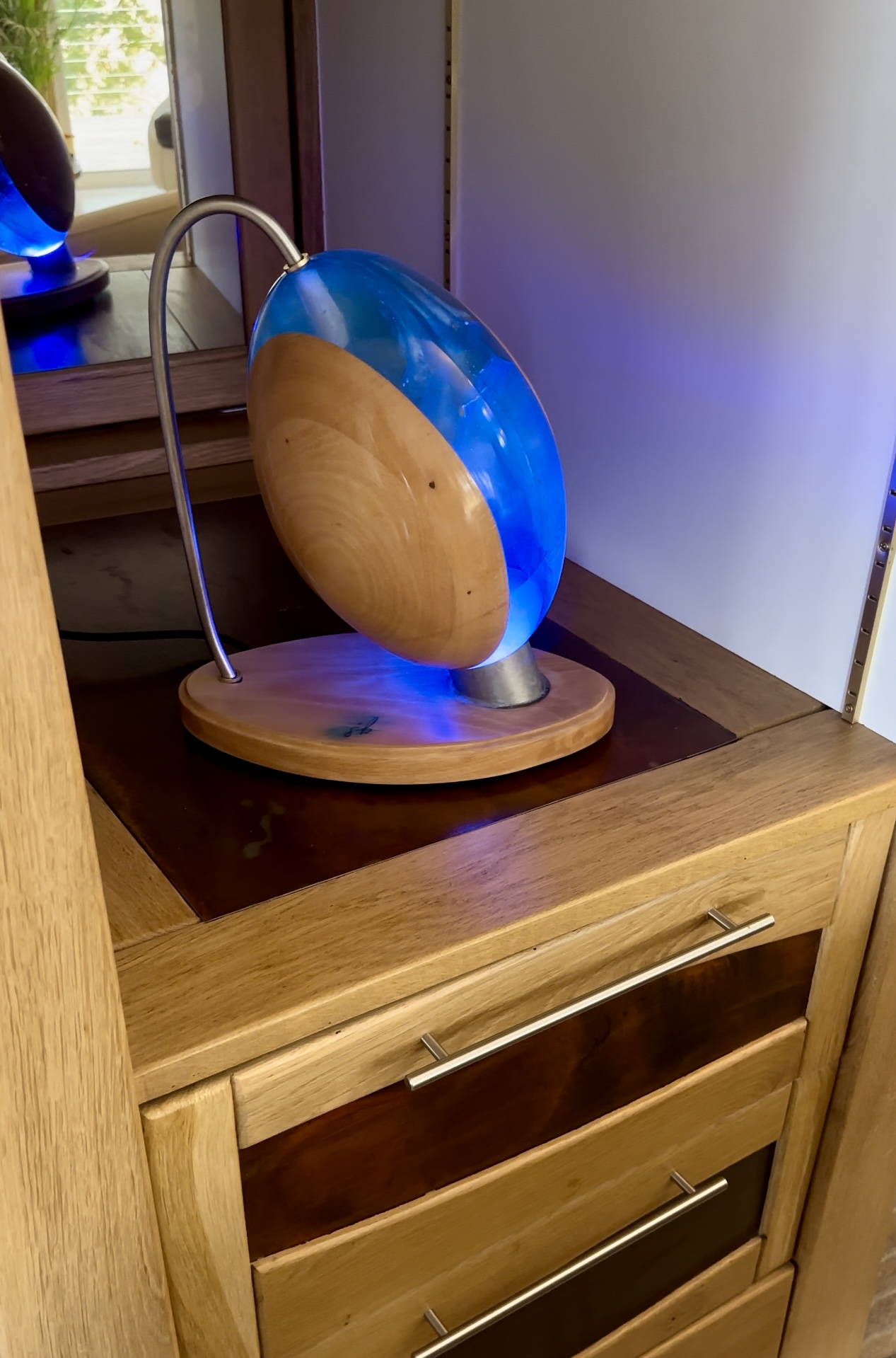 La deuxième partie de la lampe est fabriquée à partir d’une résine fournie par un fournisseur allemand, spécialement conçue pour permettre la diffusion de la lumière. Vous pouvez commander l’ampoule pour changer la couleur de l’éclairage selon vos envies et l’ambiance que vous souhaitez créer.
