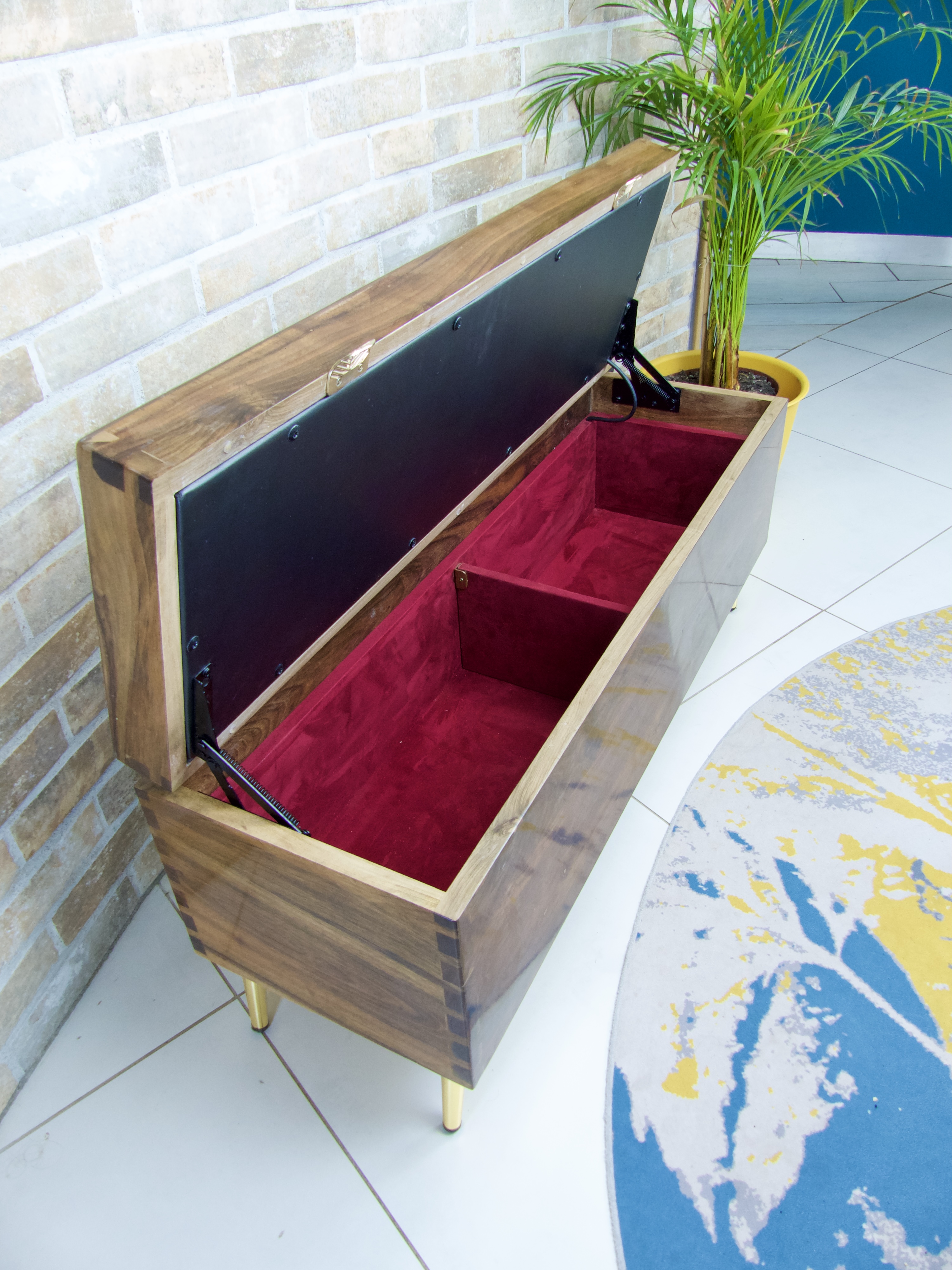 Pour une touche moderne, un éclairage a été intégré au coffre-banc, avec un interrupteur tactile permettant d’allumer ou d’éteindre la lumière. Cet interrupteur fonctionne au contact de mon logo, ajoutant une touche personnalisée à cette pièce d’exception.