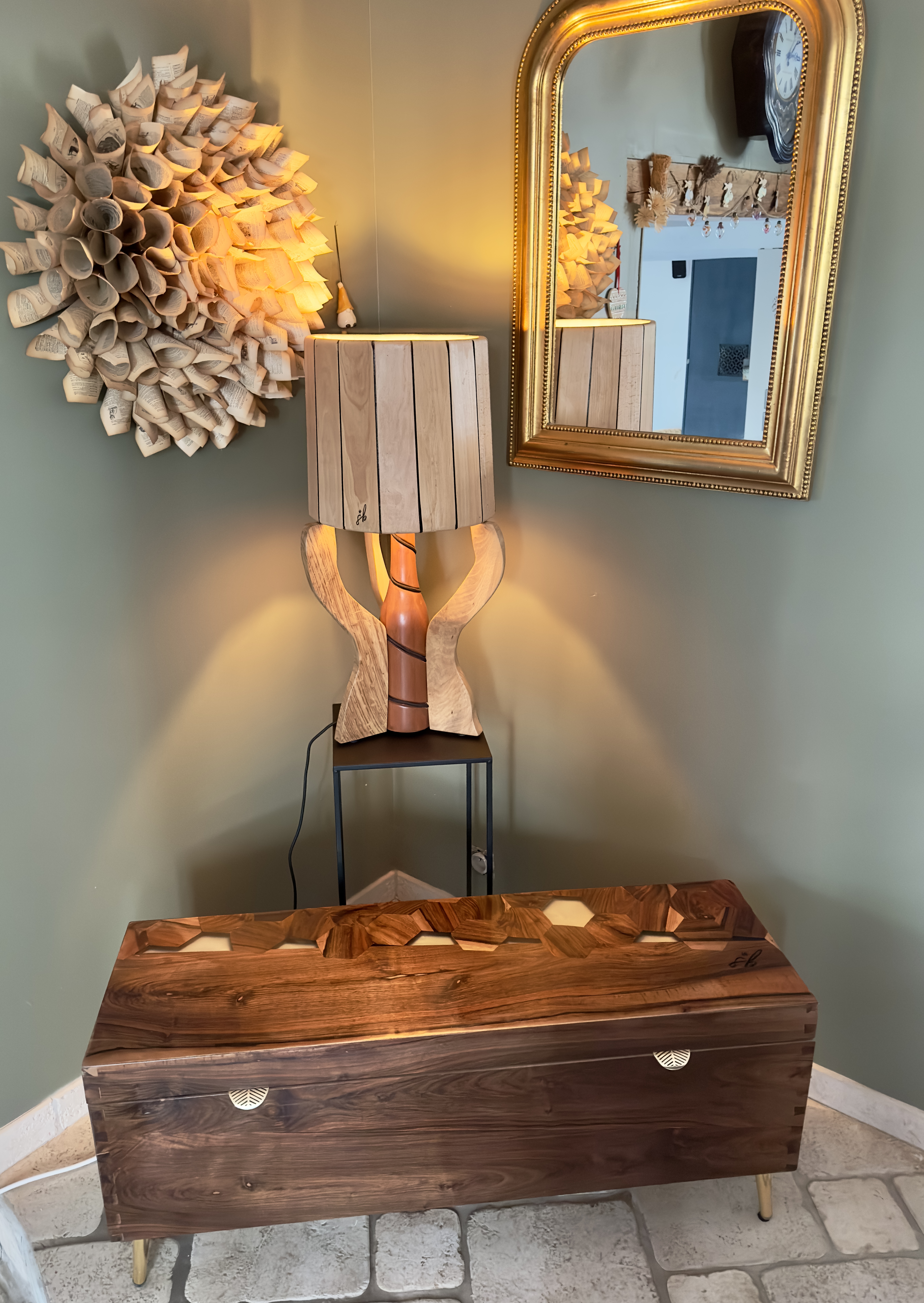 Les assemblages en queue d’aronde réalisés dans les angles du coffre ajoutent une touche d’élégance et de solidité à l’ensemble. Sur le dessus du coffre, une marqueterie en forme d’hexagone a été créée, combinant bois et hexagones en résine pour un effet visuel unique.