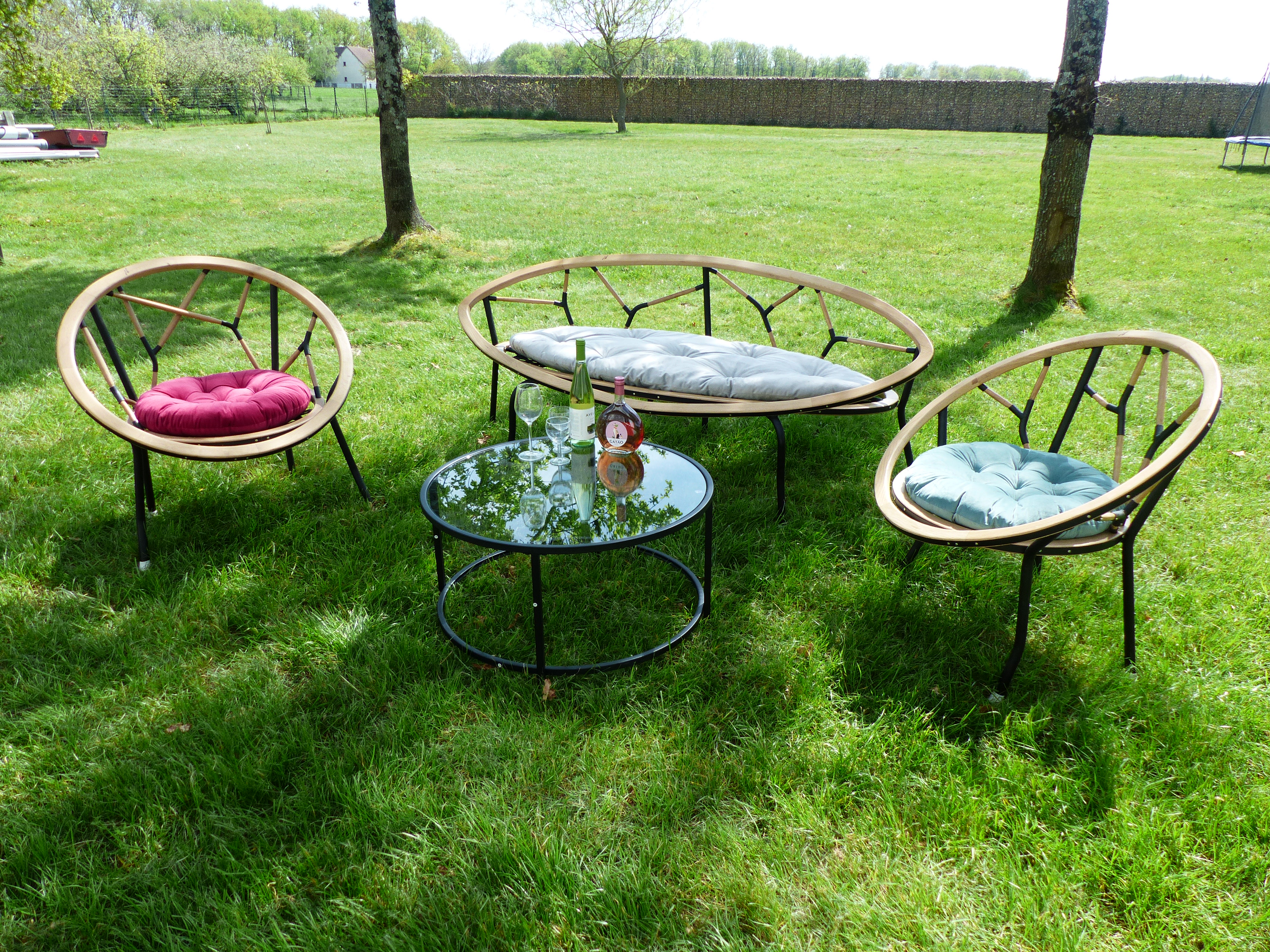 Ce salon unique a été créé avec l’idée de relier l’homme et l’environnement de manière organique. Nous avons utilisé deux anneaux de bois de diamètres différents, cerclés d’acier, pour créer les assises et les dossiers des fauteuils. La connexion de ces anneaux est réalisée avec des tubes cintrés, qui servent également de pieds pour les fauteuils. Les dossiers des fauteuils sont composés de plusieurs rameaux en bois assemblés avec des tubes courbés. Pour un confort optimal, nous avons ajouté des coussins moelleux pour les assises.
