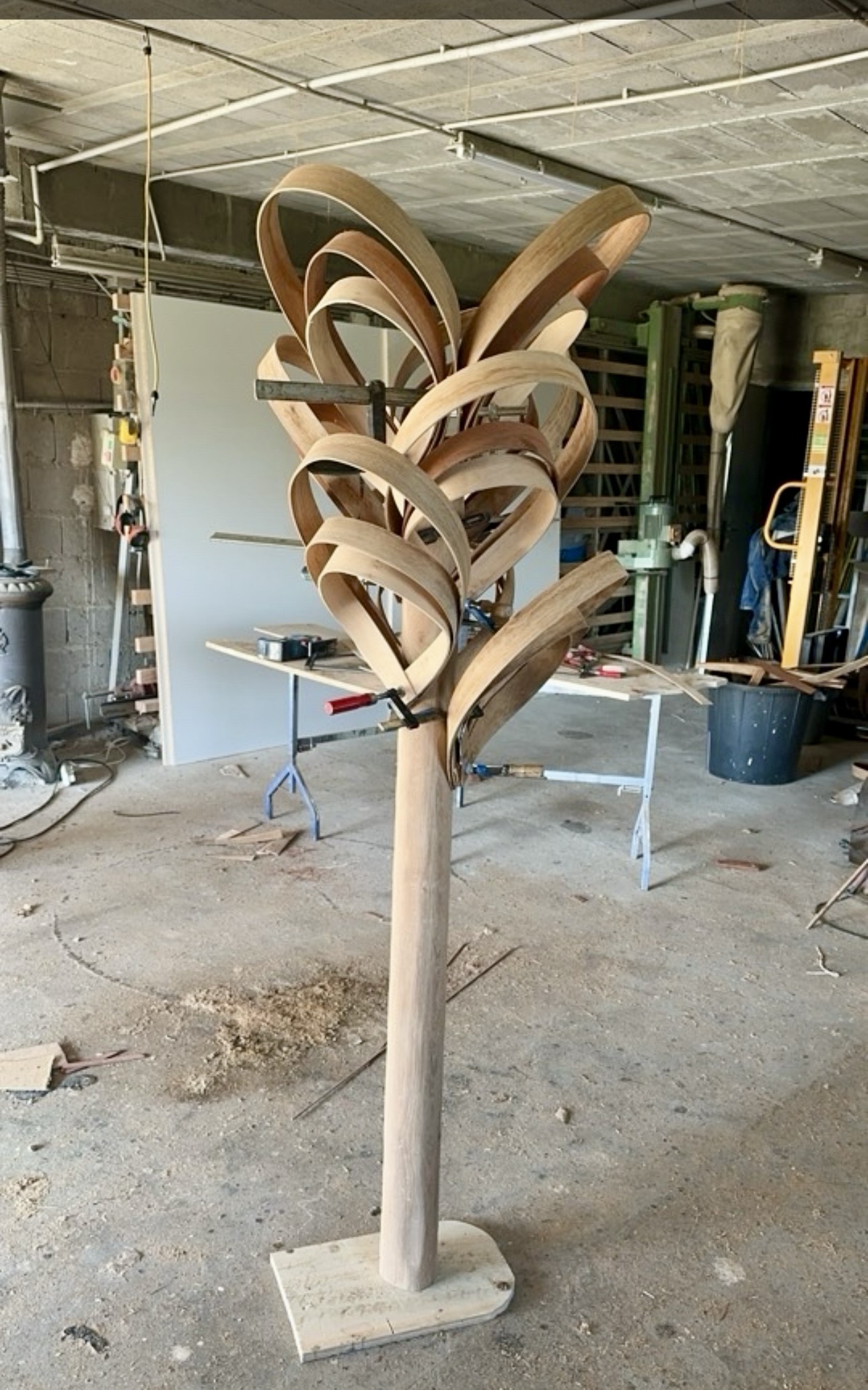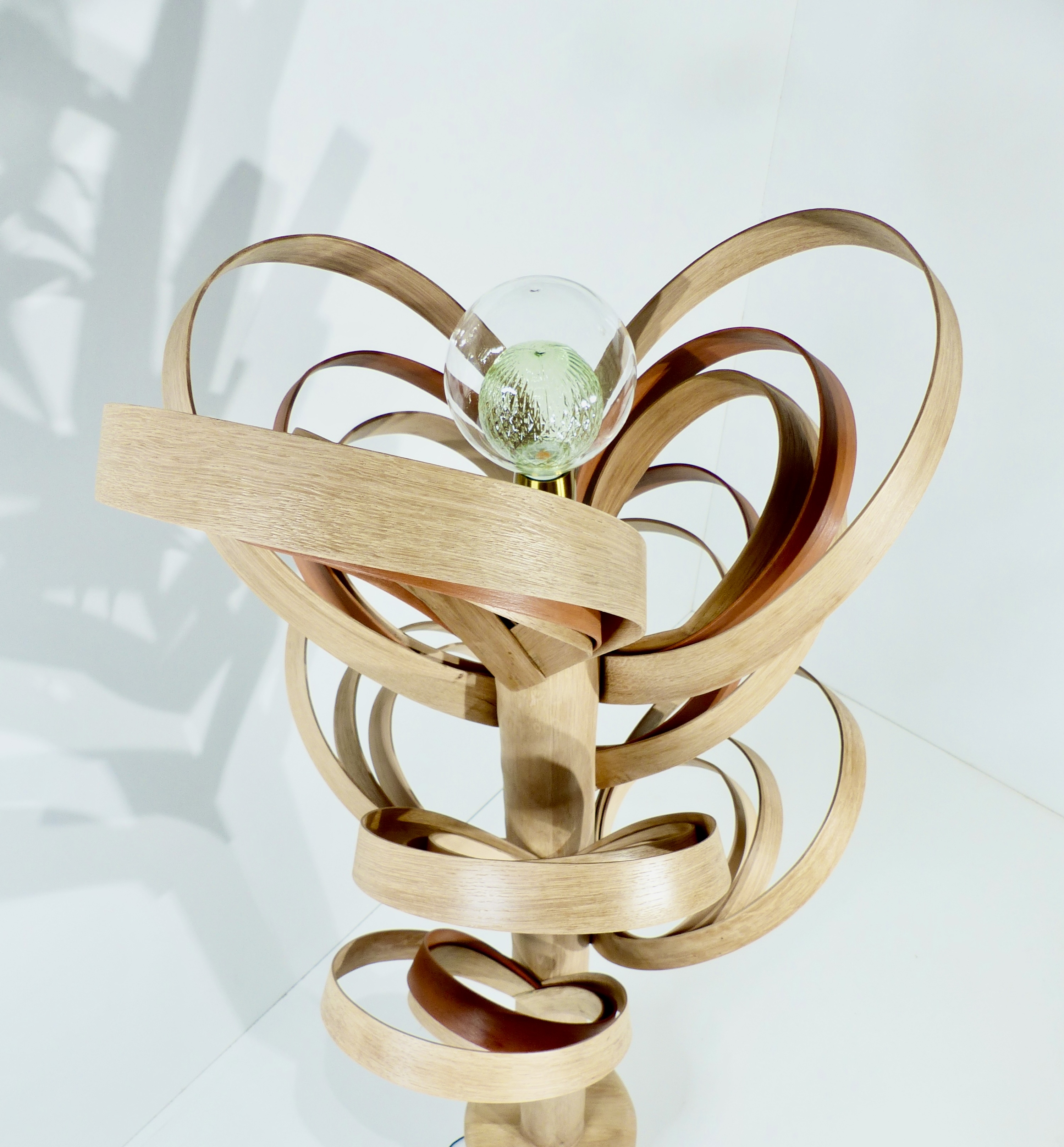 Fabriquée à partir de bois local, notamment du chêne de l orme provenant de la région du Loiret, ainsi que du bois africain appelé Sipo, cette lampe allie beauté et durabilité. Les bois ont été soigneusement choisis pour leur couleur et leur capacité à être cintrés à la vapeur, permettant ainsi d’obtenir la forme d’une feuille réaliste.