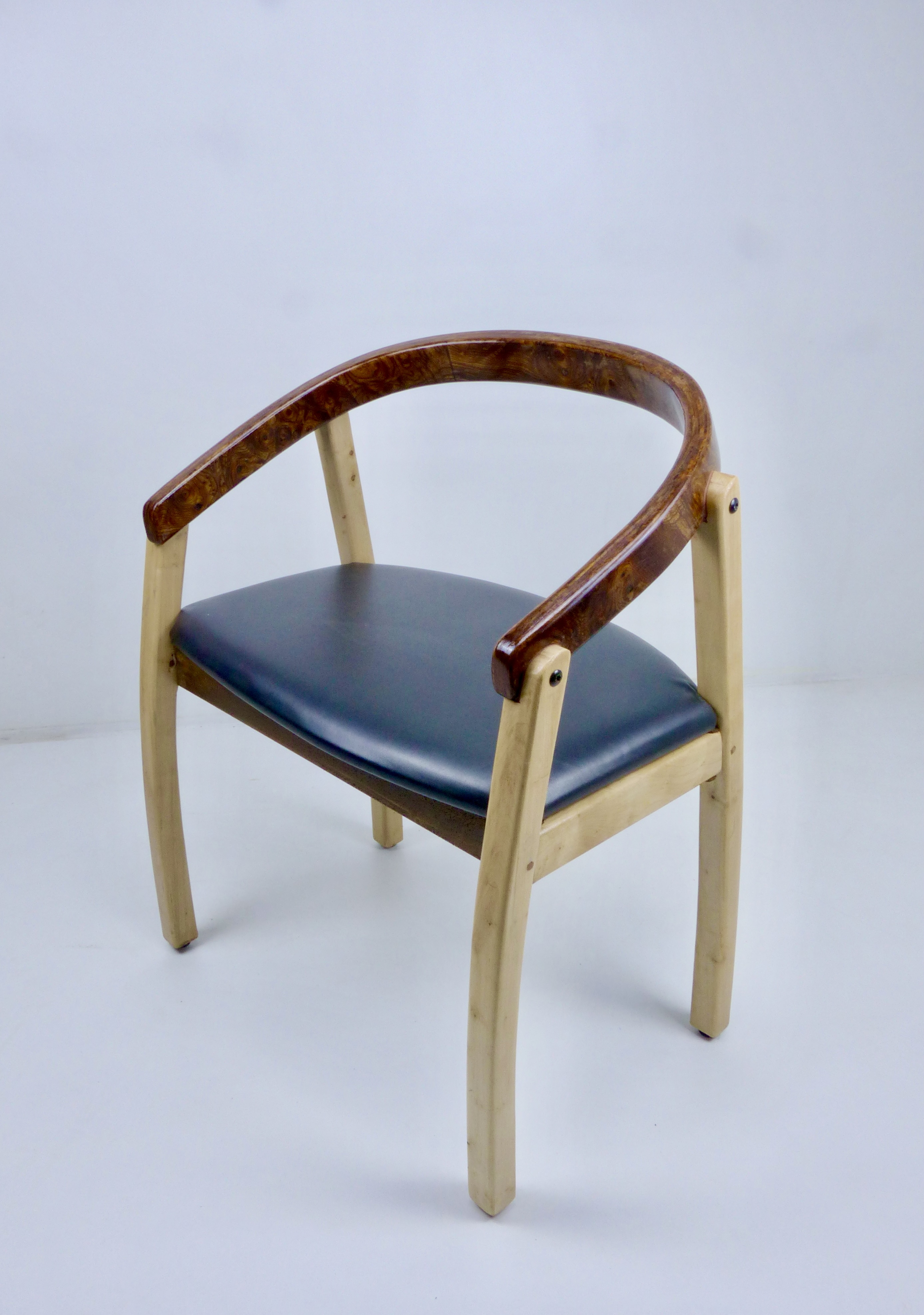 Les 6 chaises qui accompagnent cette table sont également des pièces uniques. Le dossier est réalisé en Loope d’Orme, tandis que les pieds sont en orme blanc, un autre bois local du Loiret. Les traverses avant et arrière des chaises sont en acier rouillé, ajoutant une touche de robustesse et de caractère.