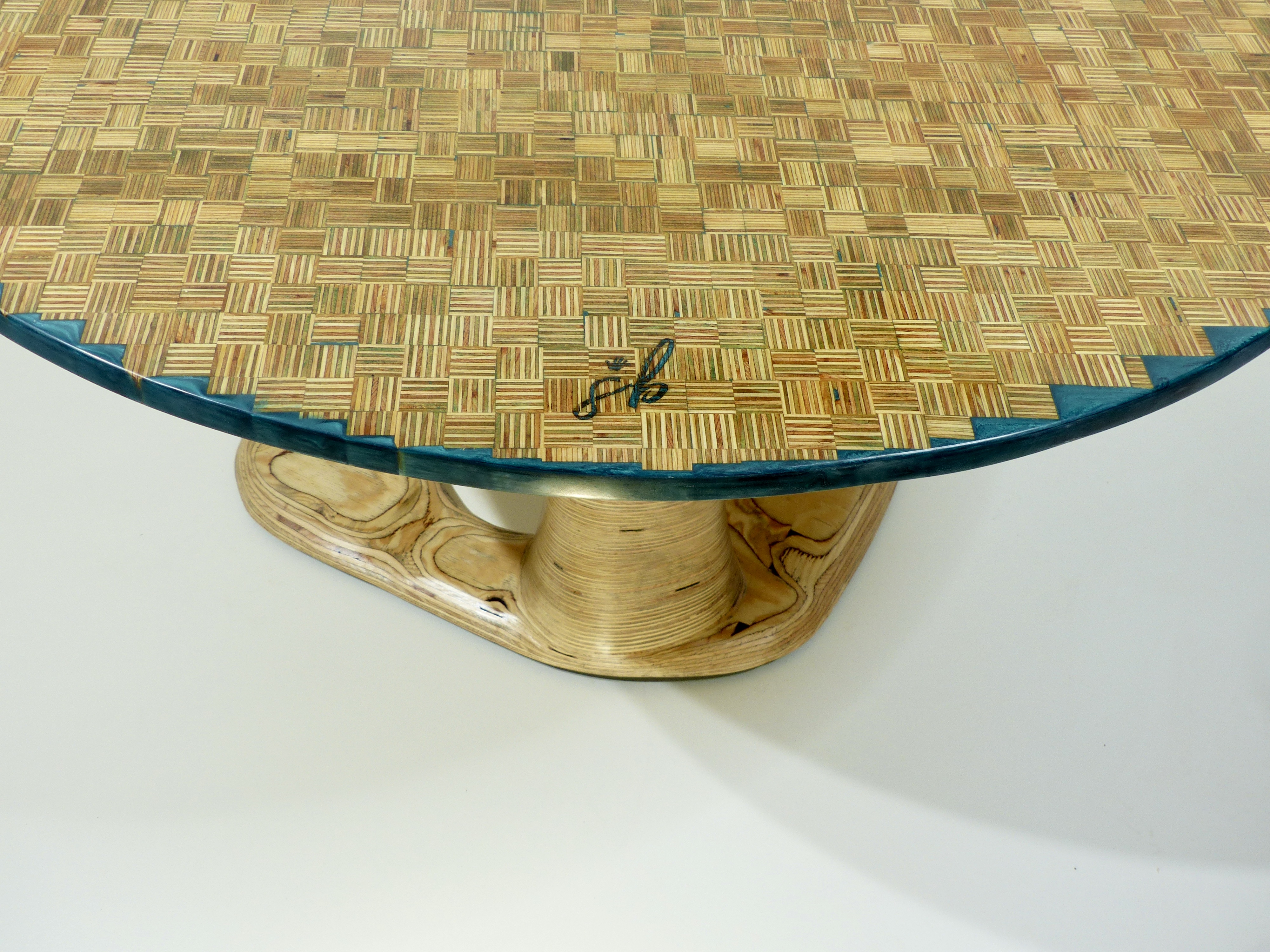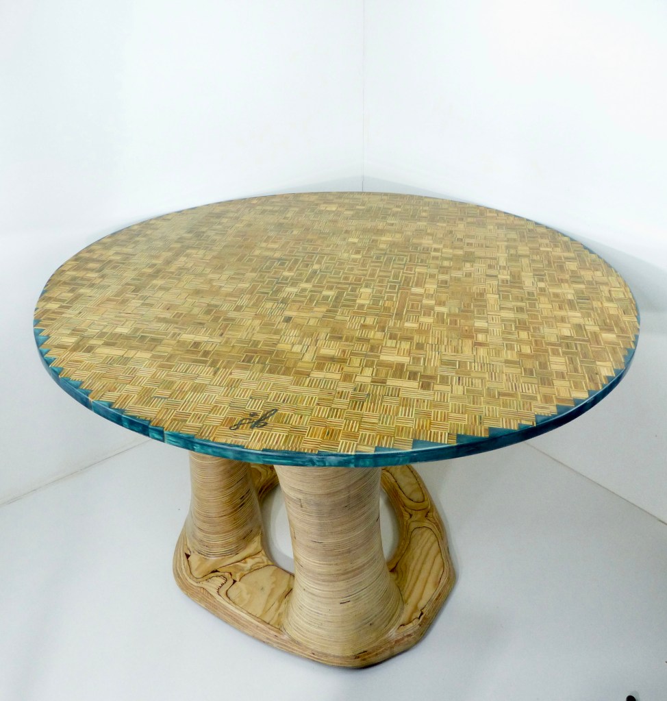Cette table est de forme ronde, avec des dimensions de 1,60 mètre. Son design moderne et convivial la rend parfaite pour les repas en famille ou les réunions entre amis. Son pied est réalisé en empilant des panneaux en forme de stalagmites, créant ainsi une pièce maîtresse artistique et solide.